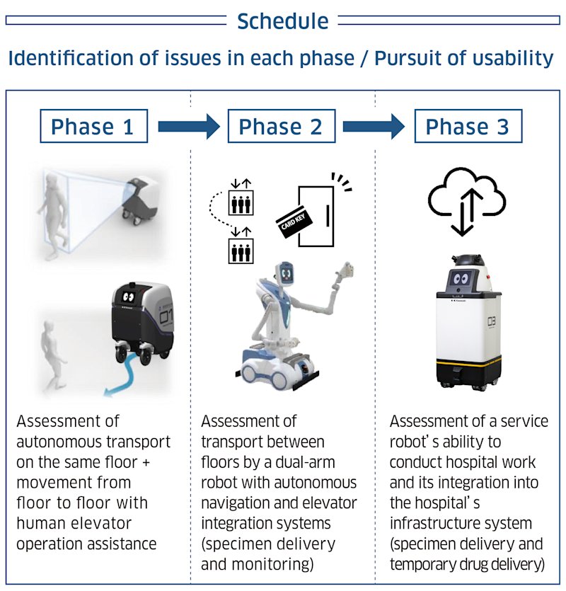 Demonstration testing has been carried out in Phases 1 to 3. In each phase, the team developed hypotheses related to the challenges underlying the needs of healthcare professionals and reconciled the technical requirements with these hypotheses. The robot and the operating applications necessary for the demonstration testing were then prototyped and subject to demonstration tests to further identify the hurdles and functional requirements.