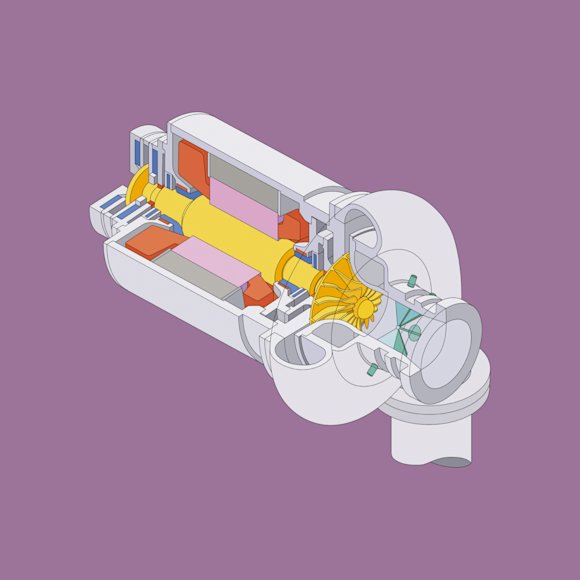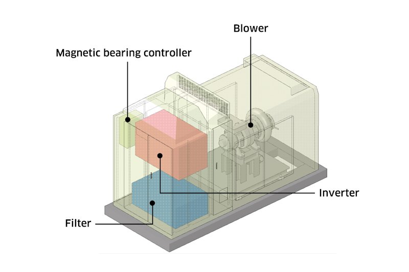 The high-speed motor contains a rotor that rotates at a high speed. It is integrated with magnetic bearings. The rotation speed is variable via inverter control, which optimizes the speed according to the inlet condition.