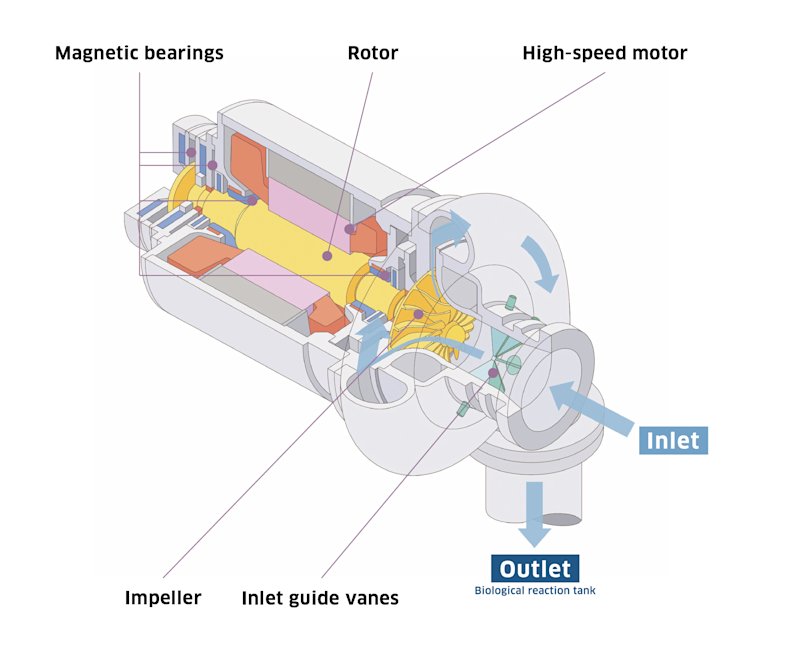 Aeration blowers are installed at sewage treatment plants to supply air to biological reaction tanks, where organic matter contained in wastewater is decomposed. Aeration blowers are one of the key facilities in sewage treatment, and they come in various types, including turbo blowers and positive displacement blowers. The existing types of blowers are all mature machinery: no major changes to their basic structure had been made until the Kawasaki MAG Turbo introduced a technological innovation.
