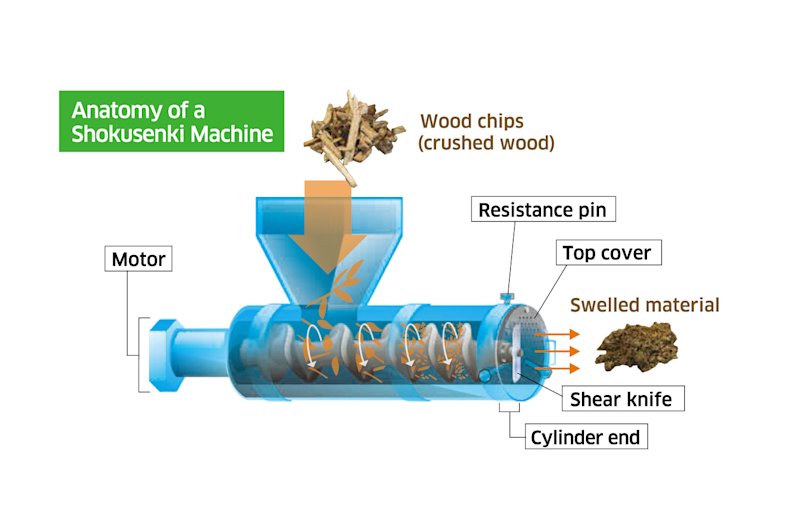Then, the compressed wood chips enter the cylinder end – the highlight of the process in the Shokusenki. The 50-cm-long section has three 15-cm-long resistance pins, which are 5 cm in diameter and are attached to three different points around the circumference, and which further compress and break raw materials into fibers. The chips are then sheared into even smaller fragments by a shear knife rotating near the discharge point and ejected from the discharge holes.