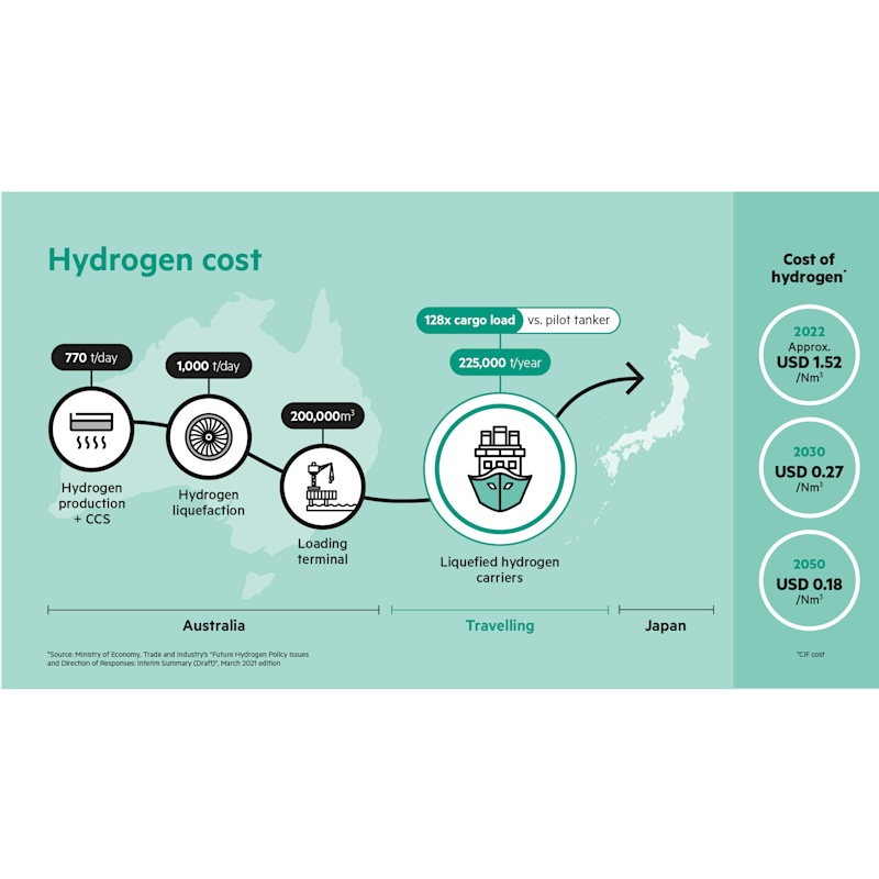 The Suiso Frontier’s journey is part of a pilot project by a consortium of Japanese and Australian companies and backed by their governments to make and transport liquefied hydrogen by sea to an international market at scale. The goal is to demonstrate the technical viability of such a hydrogen supply chain by the late-2020s and aim for commercialisation around 2030. Once in the commercial phase, 225,000 tonnes of liquefied hydrogen will be imported to Japan per year, which will go through further production.