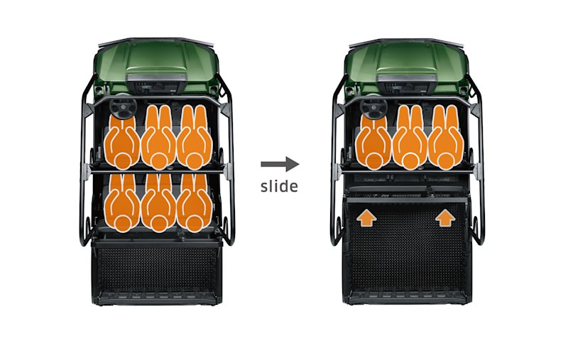 The PRO-FXT combines a wide body with a roomy interior to allow six adult passengers to be seated comfortably. The cabin is equipped with a unique convertible rear seat area, which enables the cargo bed to be increased by sliding the rear seats forward. The Trans Cab mechanism has been developed to enable one person to change the seating in just one minute by making one trip around the vehicle. The rear seats can be slid forward to create more flat space.