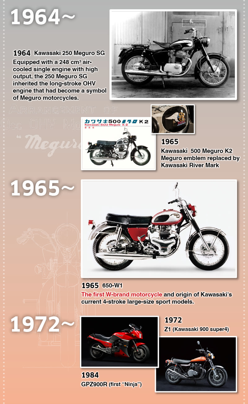 The former Meguro engineers continued to demonstrate their skills after the merger with Kawasaki, as they became deeply involved in development of the 1972 Kawasaki 900 Super 4 (known as the Z1) and the 1984 GPZ900R (the original Ninja). Kawasaki is the world-class motorcycle manufacturer it is today thanks to the innovative technological knowhow gained through aircraft manufacturing, combined with Meguro's top-notch chassis design and machining skills.