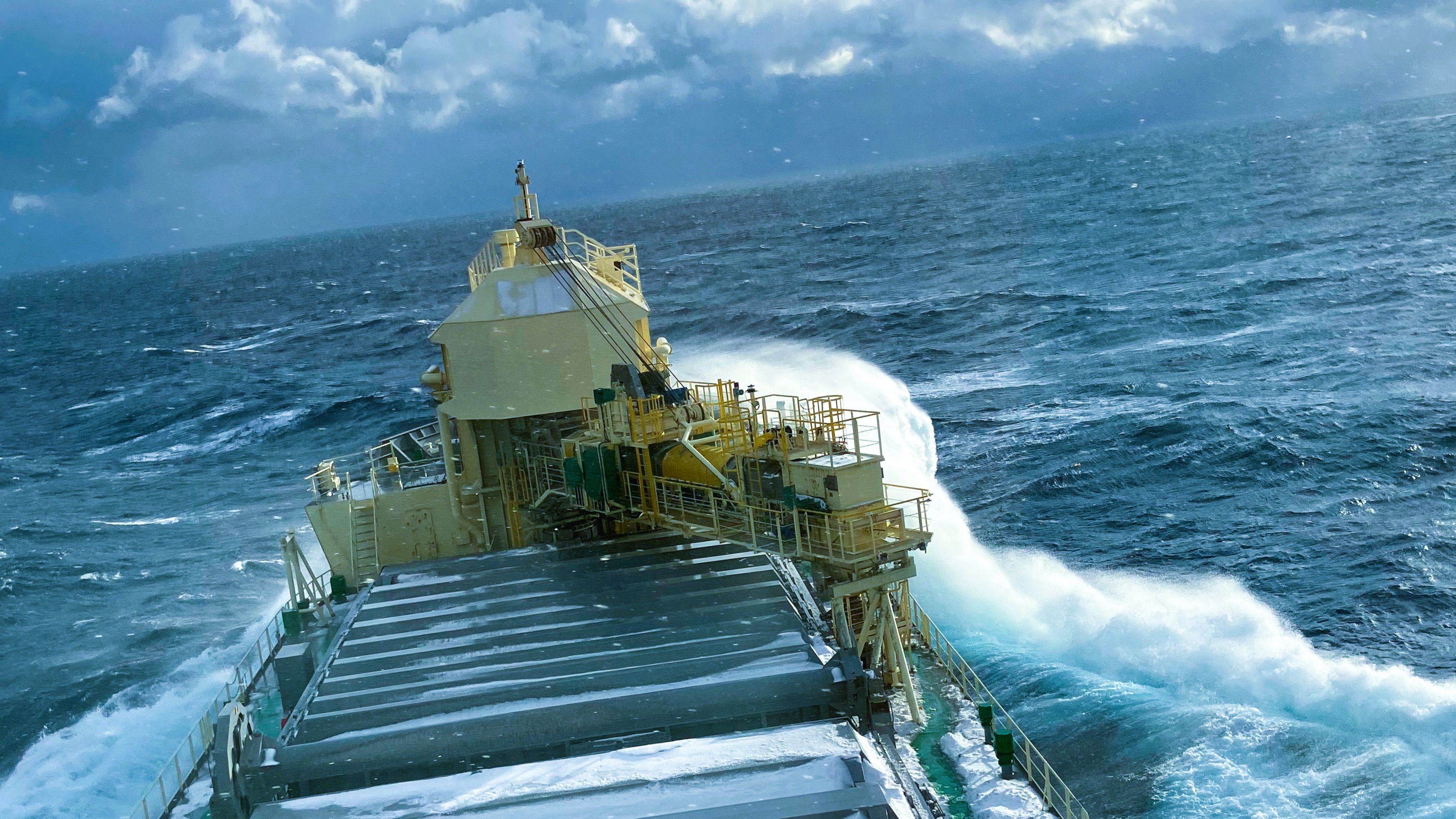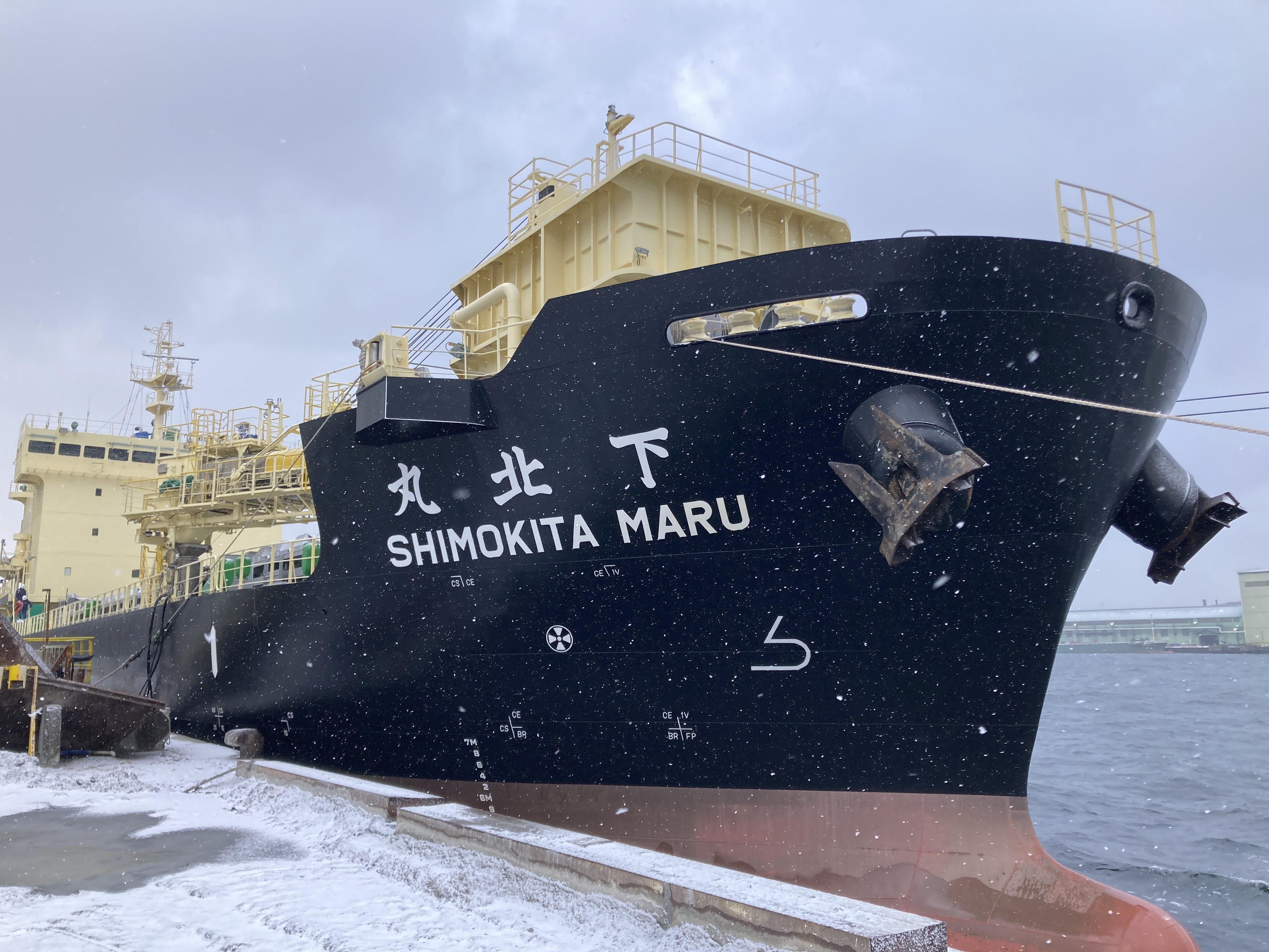 Named the Shimokita Maru, this bulk carrier moves limestone from Shiriyamisaki Port to the iron mill in Muroran, Hokkaido, making the roughly 110-kilometer journey across the Tsugaru Strait on a daily basis. Shiriyamisaki Port is an industrial port located near the limestone mine site, which is situated close to the northeastern edge of the Shimokita Peninsula in Aomori Prefecture (at the northern end of Japan’s Honshu island). The surrounding sea is known for its formidable meteorological and hydrographic phenomena, including most notably the six- to eight-meter-high waves during winter. Despite such harsh conditions, the Shimokita Maru and its operator, NSU Naiko, have been providing reliable transport services for many years, earning solid trust from shippers.