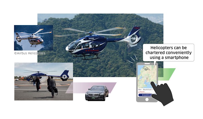 Statistics show that, on average, a helicopter in Japan flies less than one hour per day. This web-based service will connect these underutilized helicopters with consumers who wish to charter helicopters. Backed by its highly-trusted helicopter production and maintenance capabilities, Kawasaki will play an integral role in connecting these two parties.