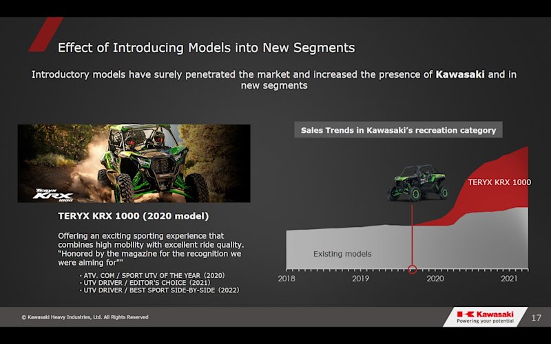 Overall the main market for ROVs is shifting towards faster and larger models, with introductory models in new segments gaining attention and popularity. Kawasaki is therefore aiming to introduce new models in new segments, taking advantage of its unique technologies. One example of such success is the TERYX KRX 1000 (2020 model), which has boosted Kawasaki’s presence in the ROV market. Since its launch the TERYX KRX 1000 alone accounts for almost half of total ROV sales.