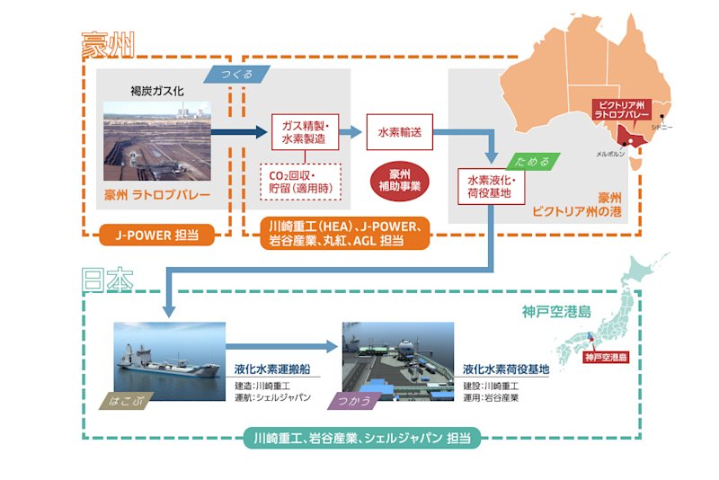 HySTRAにおいて4社はそれぞれ次のような役割を担っています。①J-POWER=オーストラリア・ビクトリア州での褐炭を原料とする水素製造技術の構築、②川崎重工とシェルジャパン=液化水素運搬船の建造と運航技術の確立、③川崎重工と岩谷産業=液化水素荷役基地の建設と運用技術の確立。