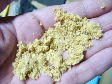 圧縮された木質チップは、植繊機のクライマックスともいえるシリンダエンドに入ります。約50cmのシリンダエンドには、太さ5cm、長さ10数cmの「抵抗ピン」と呼ばれるネジが3方向から巻き込まれており、木質チップはこれでさらに圧縮・解繊され、排出口手前で回転する「シャーナイフ」によってバラバラにカットされて排出穴から一気に押し出されます。
