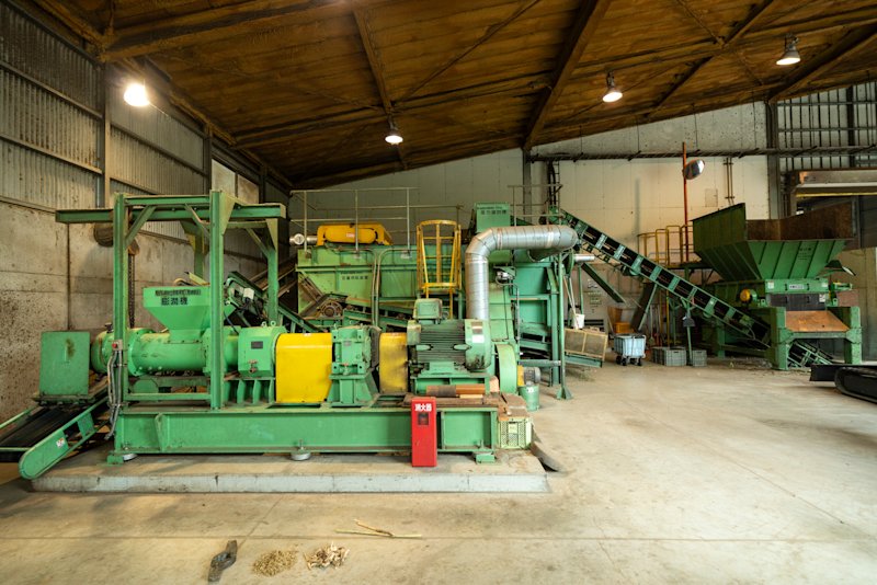 「うすき夢堆肥」の製造現場で活躍しているのが、川崎重工グループの破砕機メーカー「アーステクニカ」の破砕・膨潤処理システムです。特に膨潤機は「植繊機」という独自の技術で、破砕された剪定枝を加圧・混練・すり潰し、昇温と同時に木質内部で保持している水分を外に滲み出させます。そして最後に圧を解放して膨らませることで、微生物が住みやすい性状に変換します。