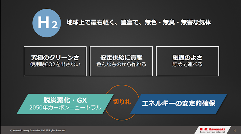 「2030年には大量の水素が海外から日本にやってくる。カーボンニュートラル達成を目指す2050年もすぐ先の未来。ぜひ『水素』を活用し、今の便利な生活そのままに、クリーンな毎日への転換を実現したい。また、企業の脱炭素経営には『水素』という選択肢があると多くの人に知ってほしい。水素社会の早期実現、これが川崎重工のSDGsへの答えだ」