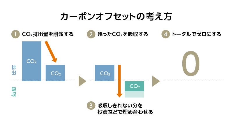 ここで注目したいのが「排出そのもの」ではなく「全体で」ゼロを目指している点です。CO2の排出を減らす取り組みは、太陽光発電など再生可能エネルギーの導入や省エネの徹底などすでにさまざまな分野で行われていますが、排出をゼロにすることはできません。だからこそ、削減しきれない分のCO2を何らかの方法で吸収することでプラスマイナス・ゼロ、つまり「全体でゼロ」にするのです。