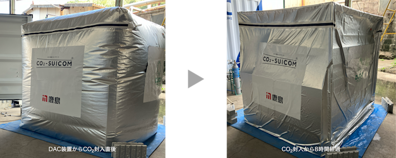 本当にいろいろな意味で暑い夏でした……(笑)。私たちとしては、「何があっても必要な量のCO2を炭酸化養生漕に送り込むんだ!」という気持ちで必死に乗り切ったように思います。試験が始まると、DAC装置から送り込まれたCO2で炭酸化養生漕が大きく膨らみ、翌朝になるとそれがすっかり収縮していて。「本当にCO2がコンクリートに吸収されたんだ!」と感動しましたし、ほっとしました。