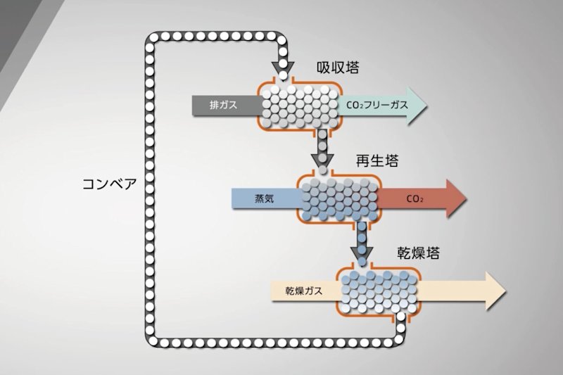 実証試験に採用されたのは、PCC移動層システム。PCC移動層システムとは、排ガス中のCO2を固体吸収剤に吸収させる「吸収塔」、固体吸収剤中のCO2を取り出して回収する「再生塔」、固体吸収剤に残された水分を除去する「乾燥塔」の3塔で構成されています。3つの塔の中を、CO2吸収剤(アミン)をコーティングした固体吸収剤を循環させることで連続的にCO2を分離回収でき、吸収剤の追加や交換が容易なこのシステムは、大規模プラントでの利用にも適しており、実用化した際には幅広い活躍が期待できます。