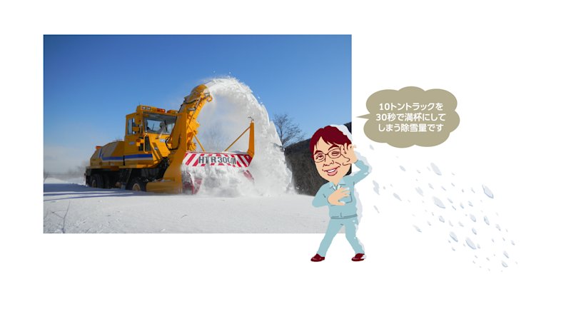 その最新鋭機が、「多機能型ロータリ除雪車 HTR300M」。なんとこの除雪車、トラック前部にあるプラウと呼ばれる斜めの除雪装置とロータリ除雪装置を簡単に取り替えられるのである。プラウで雪を路肩に寄せ、次にロータリで吹き飛ばす。従前は別々の除雪車だったが、「積雪量に応じて除雪車の効率的な運用を行い、結果として除雪コストを削減するために開発されました」(株式会社日本除雪機製作所技術部 梅田 佳彦 部長)。