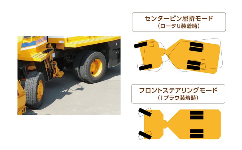 ロータリ作業時には、センターピンが屈折して狭い交差点でも容易に除雪車の向きを変えられる優れものです。