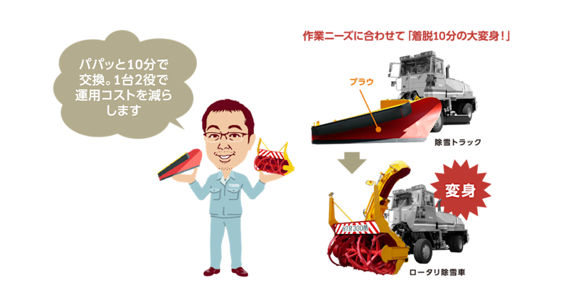 簡易着脱機構を採用しており、オペレータが短時間でかつ容易に装置を交換することが可能になった。意外に知られていない除雪機のビッグ・イノベーションである。