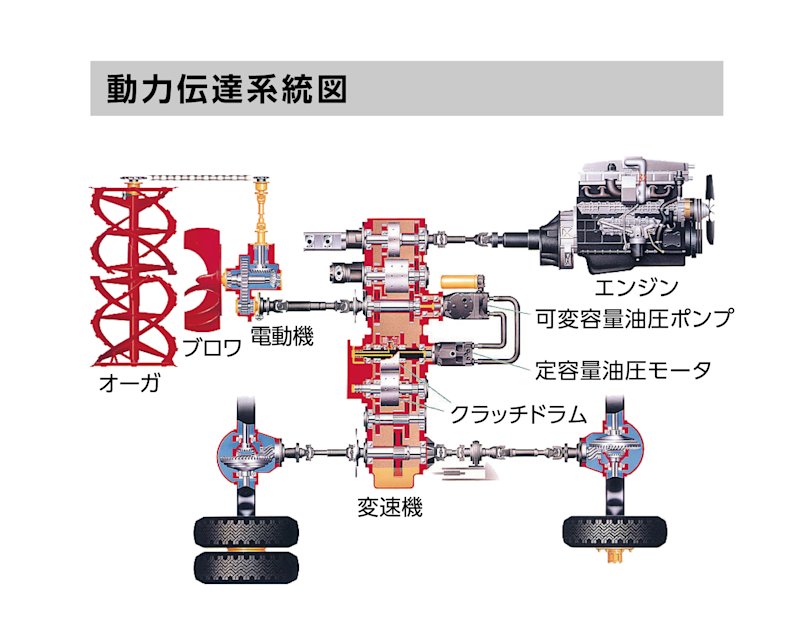 エンジンの動力を作業用と走行用の2系統に効率的に分配する「動力分配方式」で、日本除雪機製作所のオリジナル技術です。