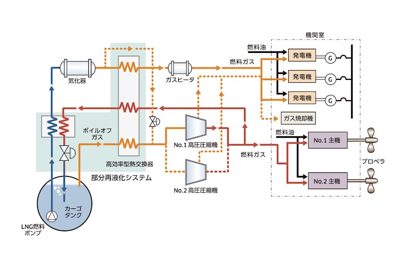 さらにエンジンプラントに川崎重工独自の「部分再液化装置」を加えることで、LNGの自然気化率(Boil off Rate)で世界最小の0.05%/日を達成しました。BOGのうち燃料として使われなかったガスを部分的に再び液化する仕組みで、いわば「もったいないをなくすシステム」が誕生しました。
