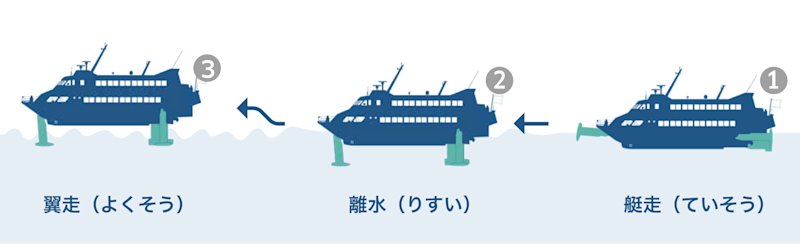 約35ノットで船体は完全に海面を離れ、波の影響を受けない翼走状態に入ります。艇走から翼走に入るまでは約1~2分間、距離にして0.9~1.8km程度。最高速度で航走していても100mほどで停止できます。