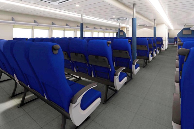 「セブンアイランド結」の船体デザインは、東京五輪のエンブレムをデザインした野老朝雄氏が担いました。船体色は藍色の「TOKYOアイランドブルー」。その上に船名やロゴが白色で描かれています。また船体の色に合わせて内装も統一され、さらに車いすでも安心して乗船できるようバリアフリー対応になっています。