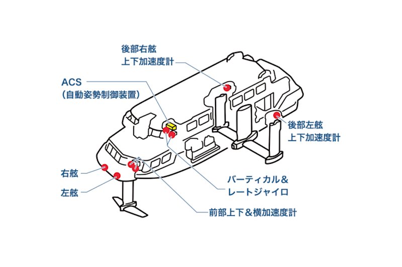 ジェットフォイルの揺れのない安定した航走を実現するのが、船の姿勢と動きを察知する8つのセンサーと自動姿勢制御装置「ACS」です。ACSにより常にピッチングとローリングなどの動揺を制御しており、乗り心地が良く船酔いをしません。