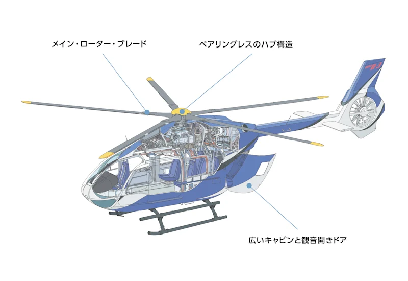 メイン・ローターが5枚ブレードになることで機体の振動は軽減され、ベアリングレスでハブ構造がシンプルになることにより、点検・整備の間隔を長くすることができます。