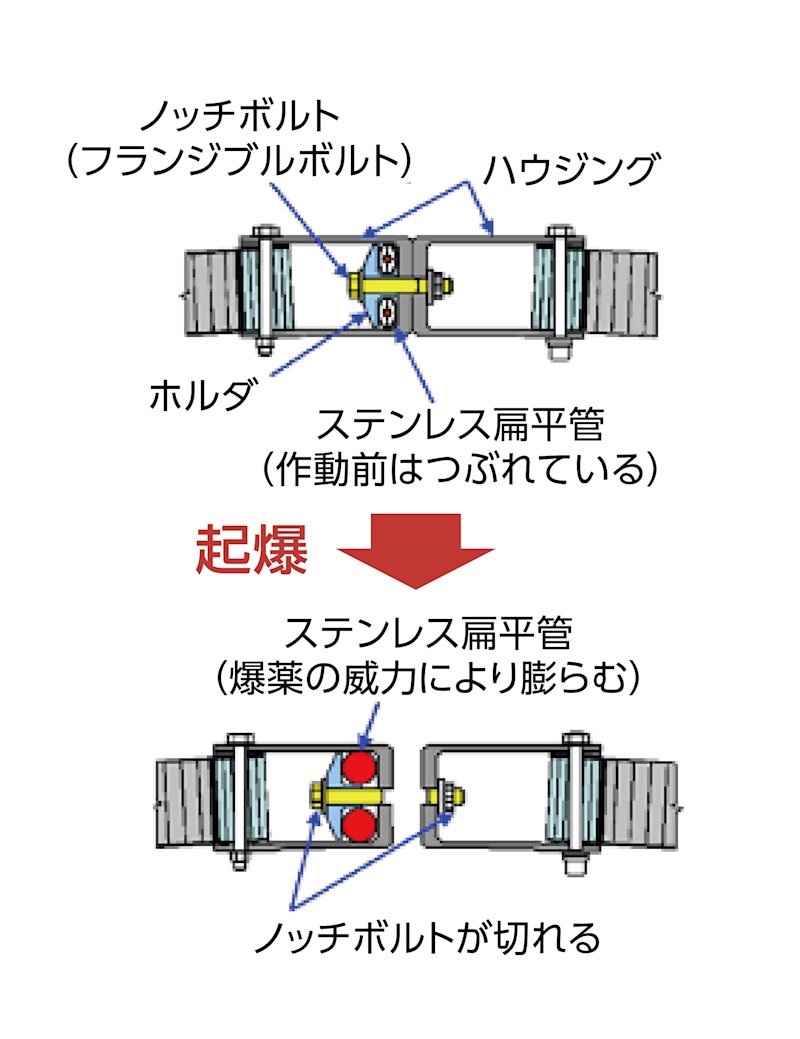 川崎重工は、戦闘機の操縦席窓(キャノピー)の緊急分離装置に使われていた「ノッチ付ボルト(フランジブルボルト)方式」をベースに、日本独自の分離機構を開発。新機種にも適用できる信頼性の高い分離機構を実現しました。