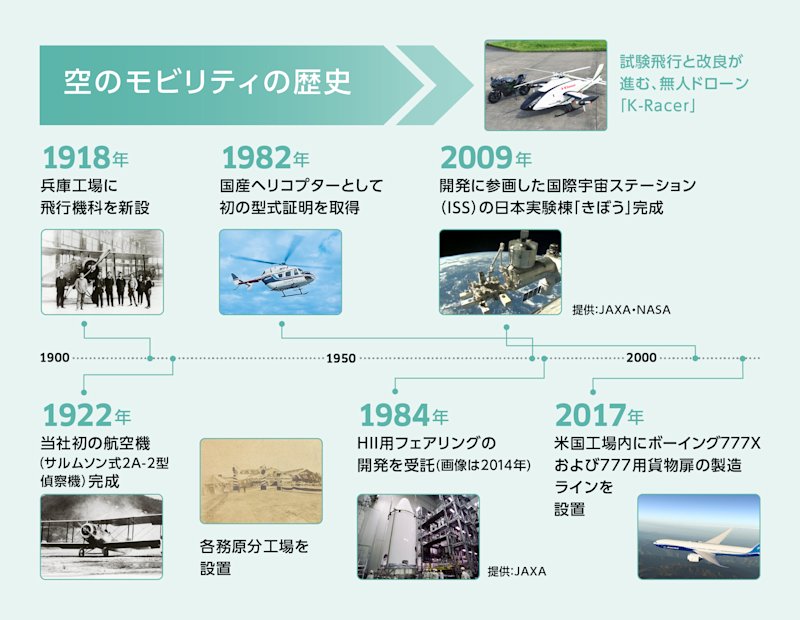 当時英ロンドンでドイツ軍による空襲に遭遇した松方幸次郎社長が、「これからは空の時代だ」と新規事業の開拓に乗りだし、すぐさま生産体制を整えたのが始まり。1922年には川崎重工にとって初めての飛行機としてサルムソン式2A-2型偵察機の試作機を完成させ、陸軍最初の制式機「乙式1型偵察機」として採用されました。またその4年後には日本初の全金属製飛行機を完成(1926年)させ、陸軍に87式重爆撃機として採用されています。 1945年の終戦とともにGHQにより航空機の生産が禁止され、我が国の航空機産業は一旦幕を閉じましたが、1952年の再開後は防衛用途に加え、ヘリコプターやジェット旅客機の部品を製造。世界の航空機メーカーのパートナーとして、最新鋭機の開発・製造を手掛ける一方、H-IIロケット用フェアリングを始めとしたロケットや衛星関連の部品や機器も扱っています。