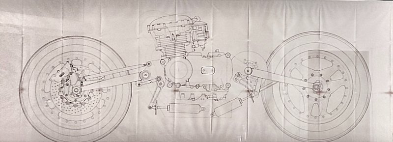 ところで、現在の新生ビモータのファクトリーには、マルコーニがビモータで最初に描いた「TESI」の設計図が飾られています。彼がビモータに入って最初に設計した作品「TESI 1D」の発表から遡ること8年前、1982年の時点でマルコーニが描き上げたそのコンセプト案に描かれているのは、なんとカワサキ製の550ccエンジン。