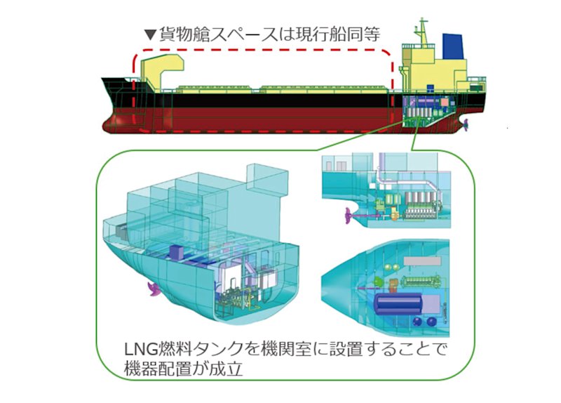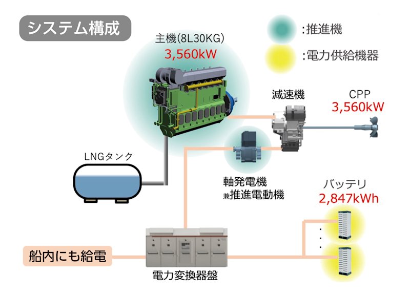 その理由が、川崎重工が納入した「川崎グリーンガスエンジン(LNG専焼エンジン)と大容量リチウムイオンバッテリー(電気)を組み合わせたハイブリッド推進システム」にあります。このシステムが、ばら積み船に搭載されるのは世界初とのこと。