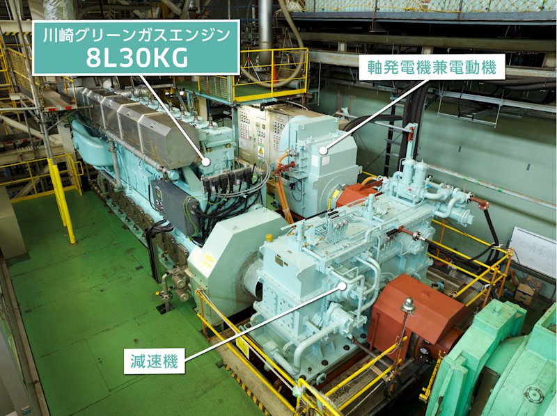 この船のエンジンは「川崎グリーンガスエンジン8L30KG」。3,560kWの定格出力で、積載重量トン数が5,646トンの船を推進します。また、推進電動機を兼ねる軸発電機も動かし、つくられた電気は船内用とするだけでなく、2,847kWh(一般的な電気自動車の約280台分に相当)という大容量バッテリーに蓄電されます。