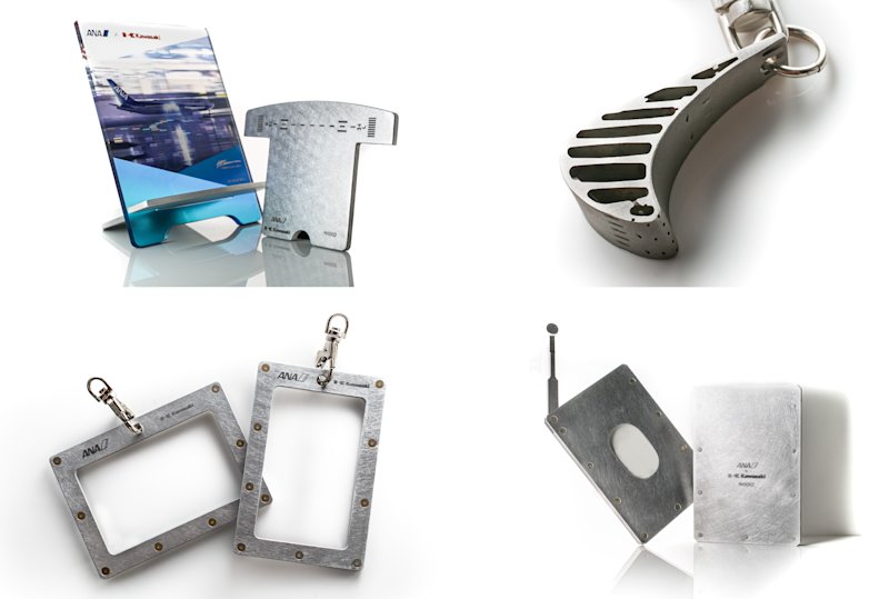 ANAと川崎重工がタッグを組み、実現したアップサイクルプロジェクト。1年半の準備期間を経て完成したのは、ボーイング737のエンジンブレードを使ったキーホルダーや、ボーイング767や777の胴体製造時に出る端材・余剰材を使ったパスケースにタブレットスタンド、名刺入れでした。私たちの日常に馴染みのあるアイテムばかりですが、見れば見るほど、触れれば触れるほど、独特の凄みを感じることができます。この小さな商品には、大空に翼を広げ数万海里を旅する巨大な航空機を作る技術が宿されているのです。