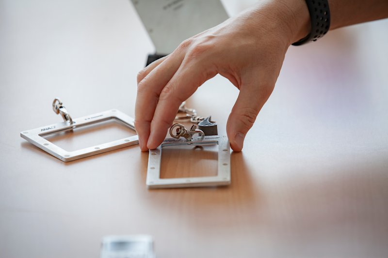 例えば、キーホルダーの材料となったエンジンブレードの加工には、ナベヤ製作所の高精度な3Dデジタル化技術や治工具製作や難削材加工で培った製造技術が。また、パスケースや名刺入れの製造には、軽合金・複合材などの部品加工から表面処理・塗装、そして機体組立までを一貫して行っている天龍エアロコンポーネントのノウハウが生かされています。